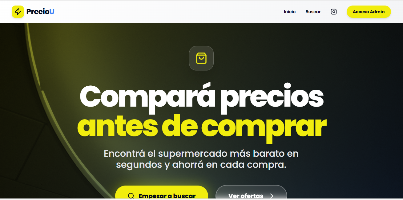 PrecioU.com.ar es una web app diseñada para comparar precios de supermercados, autoservicios, carnicerías, verdulerías, panaderías y dietéticas en segundos. El objetivo es ayudar a los usuarios a encontrar el mejor precio antes de comprar y permitir a los comercios destacar sus ofertas dentro de la plataforma.