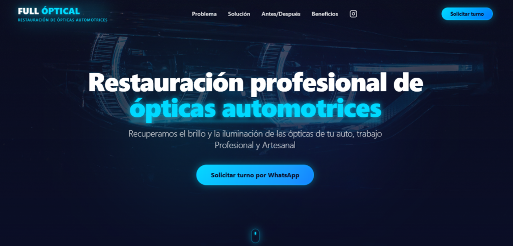 FullOptical.com.ar es una landing page desarrollada para promocionar un servicio profesional de restauración de ópticas automotrices. El objetivo del proyecto fue crear una presencia digital clara, moderna y orientada a la conversión de clientes. La web presenta de forma visual el proceso de restauración, mostrando resultados antes y después, beneficios del servicio y un sistema de contacto rápido para consultas. El diseño prioriza la confianza del usuario, destacando la calidad del trabajo y facilitando que potenciales clientes soliciten información o turnos. El proyecto fue diseñado con una estructura simple y efectiva, optimizada para dispositivos móviles y enfocada en captar clientes locales.